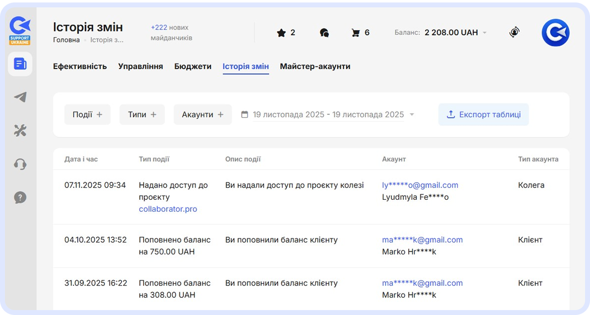 Підключивши Майстер-акаунт, ви отримуєте повний набір інструментів для управління роботою команди та клієнтів. Зокрема, ви можете: