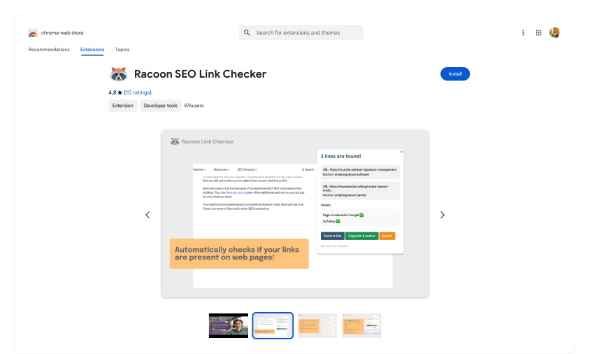 Racoon is an SEO Chrome extension that provides instant details on link attributes, indexing status, and more, all for free in a single window. By using this tool, link builders and SEO specialists save time on manually checking the backlinks they've obtained.