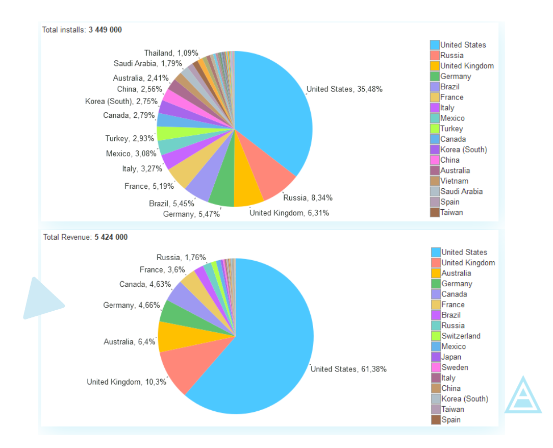 Тут лучше всего ориентироваться на конкурентов. Главное — правильно определить их список. После чего вы получаете по ним статистику из каких-либо публичных сервисов: по установкам, доходности, хотя бы примерную. Например, вы собрали 100 конкурентов и их статистику в таблице Excel. Затем эту таблицу экстраполируете в круговую диаграмму и получаете статистику в процентном соотношении для каждого региона. Если посмотреть на пример ниже, очевидно, что нам надо проработать локализации на США, Россию, Британию, Германию.