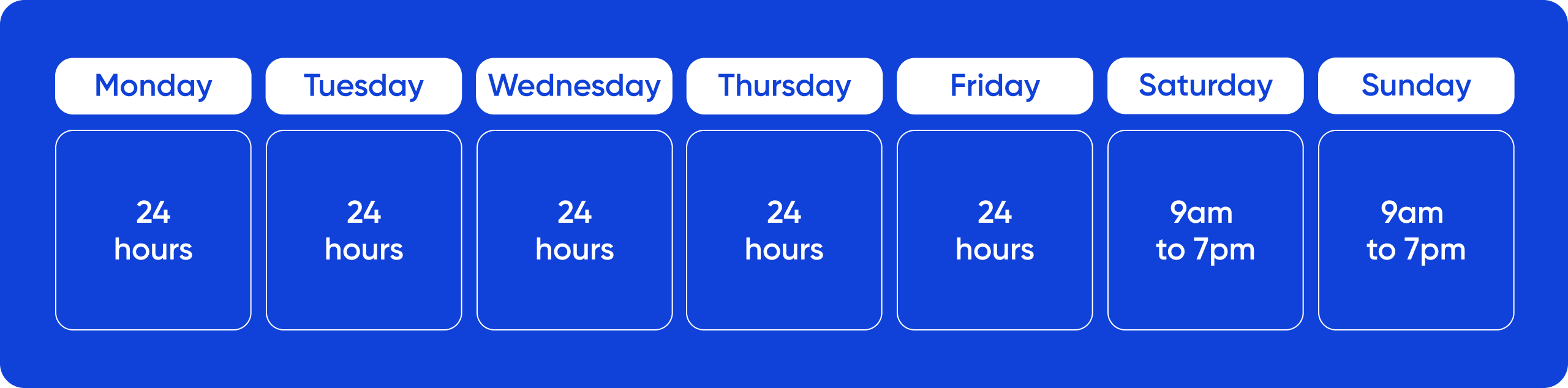 - Monday–Friday: 24 hours a day