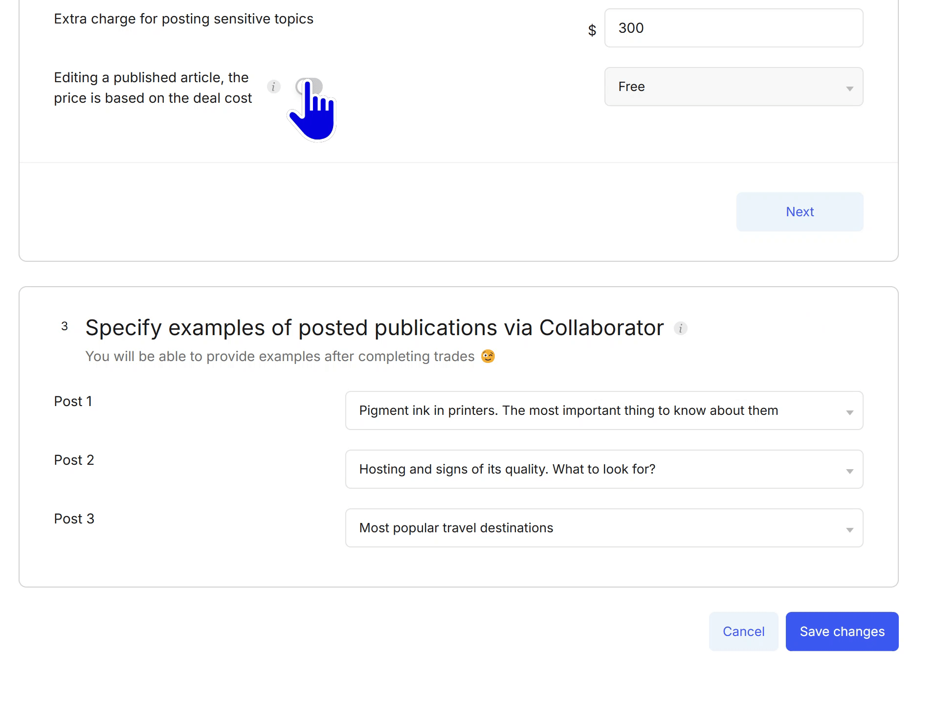 Each website owner sets their own policy — Collaborator does not influence this decision. However, the maximum fee for edits is capped at 20% of the current placement price.